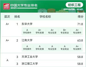 作为江南大学的传统优势学科,纺织工程专业此次以A+评级跻身全国前二,体现了其在人才培养、科研创新及行业影响力方面的卓越成就。该专业依托纺织科学与工程国家“双一流”建设学科,在智能纺织、功能性纤维材料等前沿领域持续突破,为行业输送了大批高端人才。轻化工程专业同样表现抢眼,以A评级位列全国第三,并成为纺织类高校中的第一名。这一成绩凸显了江南大学在轻工技术与工程领域的深厚积淀,尤其在绿色染整、生物纺织等方向的研究成果显著,与行业需求紧密对接。