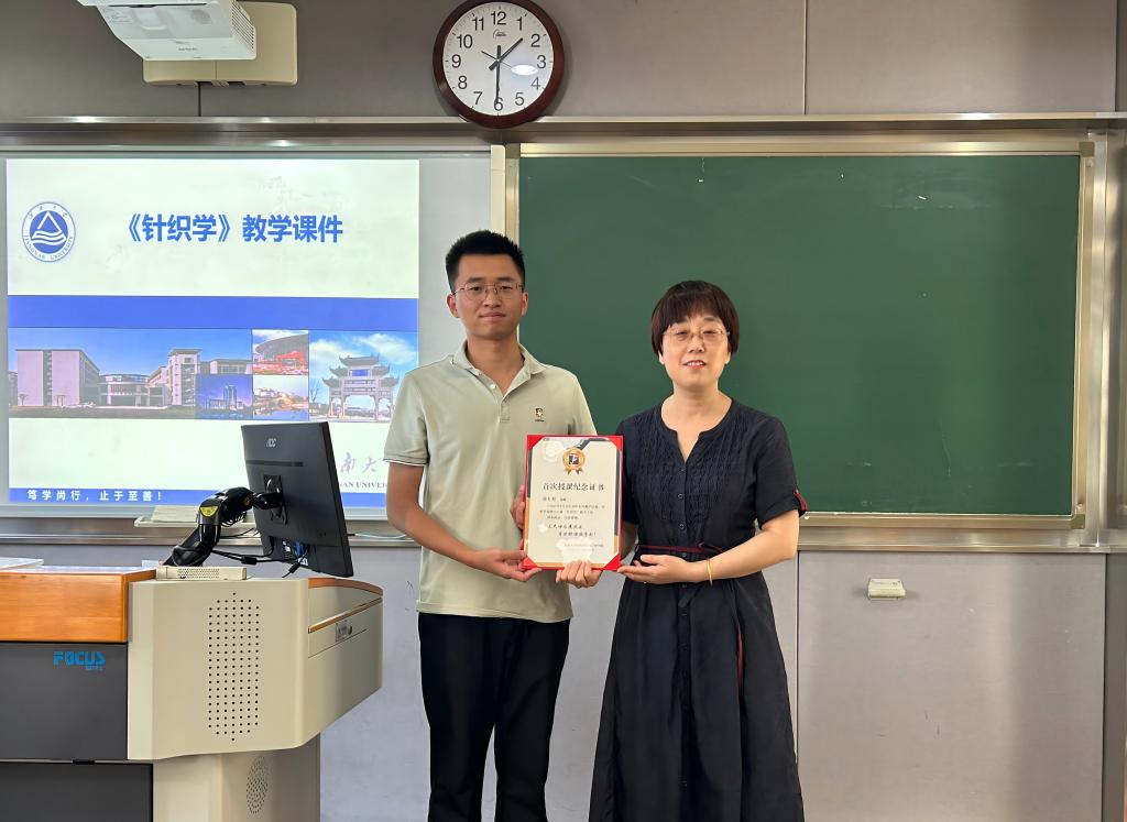 此次获授纪念证书的薛有松老师于2025年1月入职KY.COM,经过半年的岗前培训与教学准备,9月份首次为纺织2303班讲授《针织学》课程。颁发仪式上,张菁燕介绍了薛老师的学习经历和在读博期间取得的成就,她希望薛老师能将自身扎实的学术基础和创新思维带入课堂,为开元(中国)的教学工作注入新的活力。同时,她也鼓励薛老师在今后的教学道路上不断探索,积极践行“教学相长”理念,持续提升教学质量,成为深受学生喜爱和尊敬的“四有好老师”。