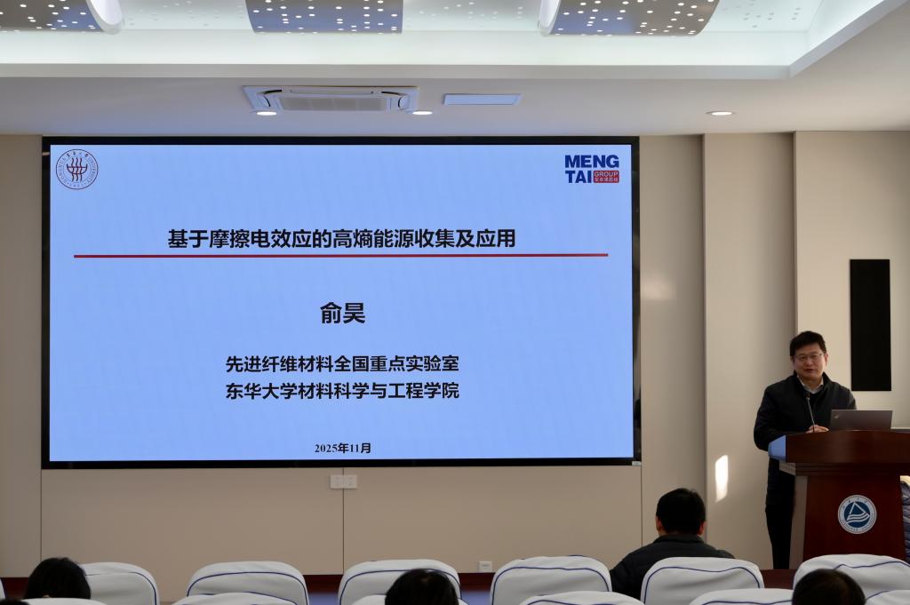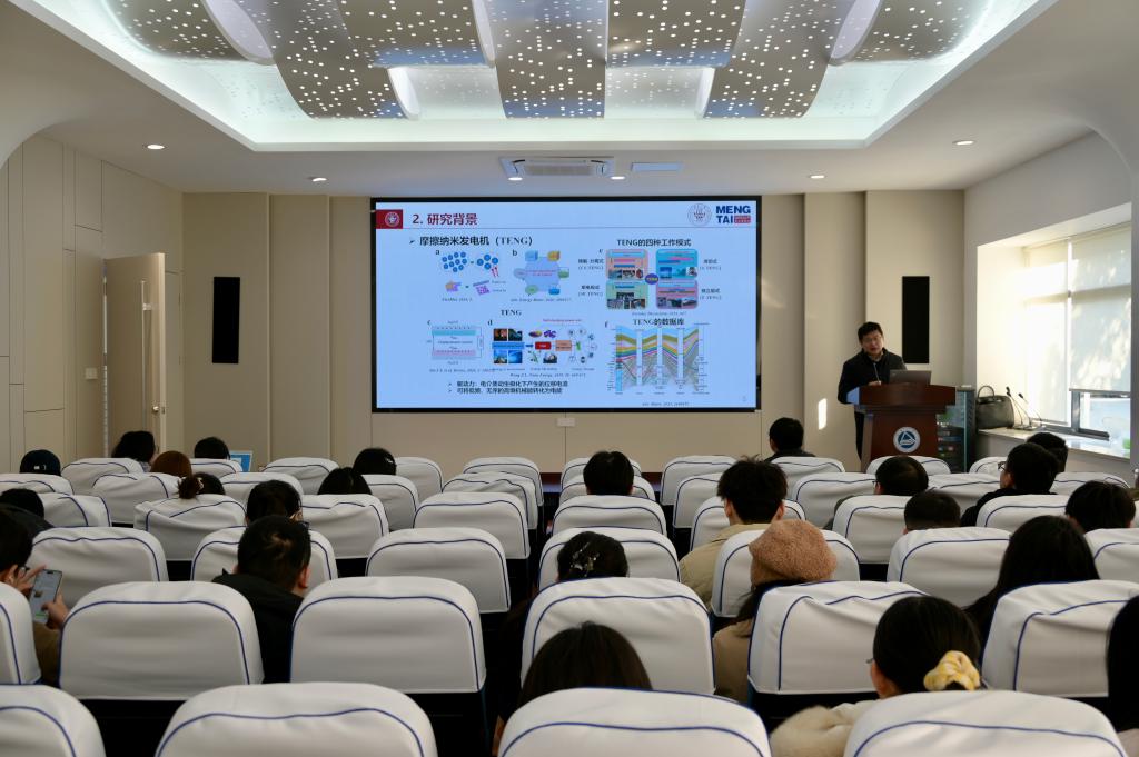报告中,俞昊研究员以自身科研实践为依托,系统阐述了摩擦电效应的研究背景、发展脉络及应用方向。他围绕静电纺纳米纤维能量增强技术、TENG结构器件一体化设计、能量收集与传感系统构建等核心内容展开深入阐述,分享内容兼具学术深度与应用价值,为摩擦电效应的智能化应用研究提供了重要启发。互动讨论环节气氛热烈,同学们踊跃发言。